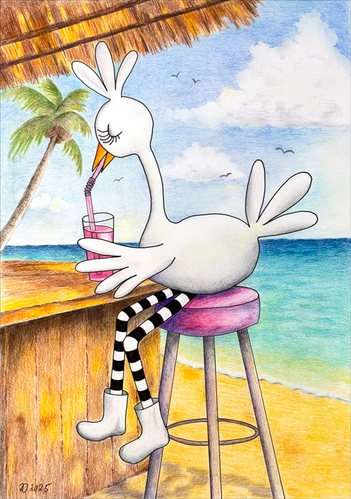 Polychromos und Fineliner auf Arches Aquarellpapier 40 x 30 cm Limohuhn macht Urlaub (2025) von Ilse Omet Online seit 29.09.2025 Anfrage zum Objekt #Malerei #Illustrationen WE Ilse Omet